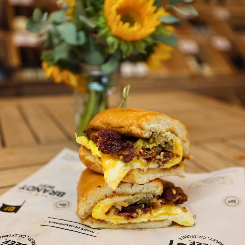 Two Fried Eggs, 4 Slices of Brandt Beef Cowboy Bacon, New School American Cheese, grilled jalapeños, chipotle mayo on a French roll.